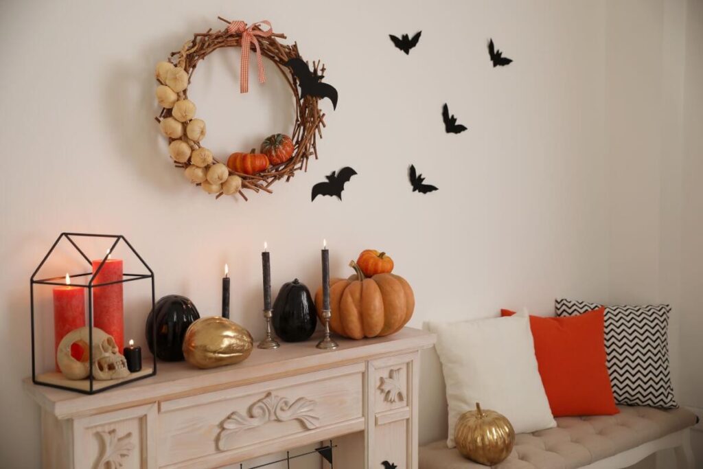 Decorative pumpkins, autumn wreaths, and scented candles add instant fall flair. Plush Faux Pumpkins and Pumpkin-Scented Candles are both seasonal and lease-friendly.